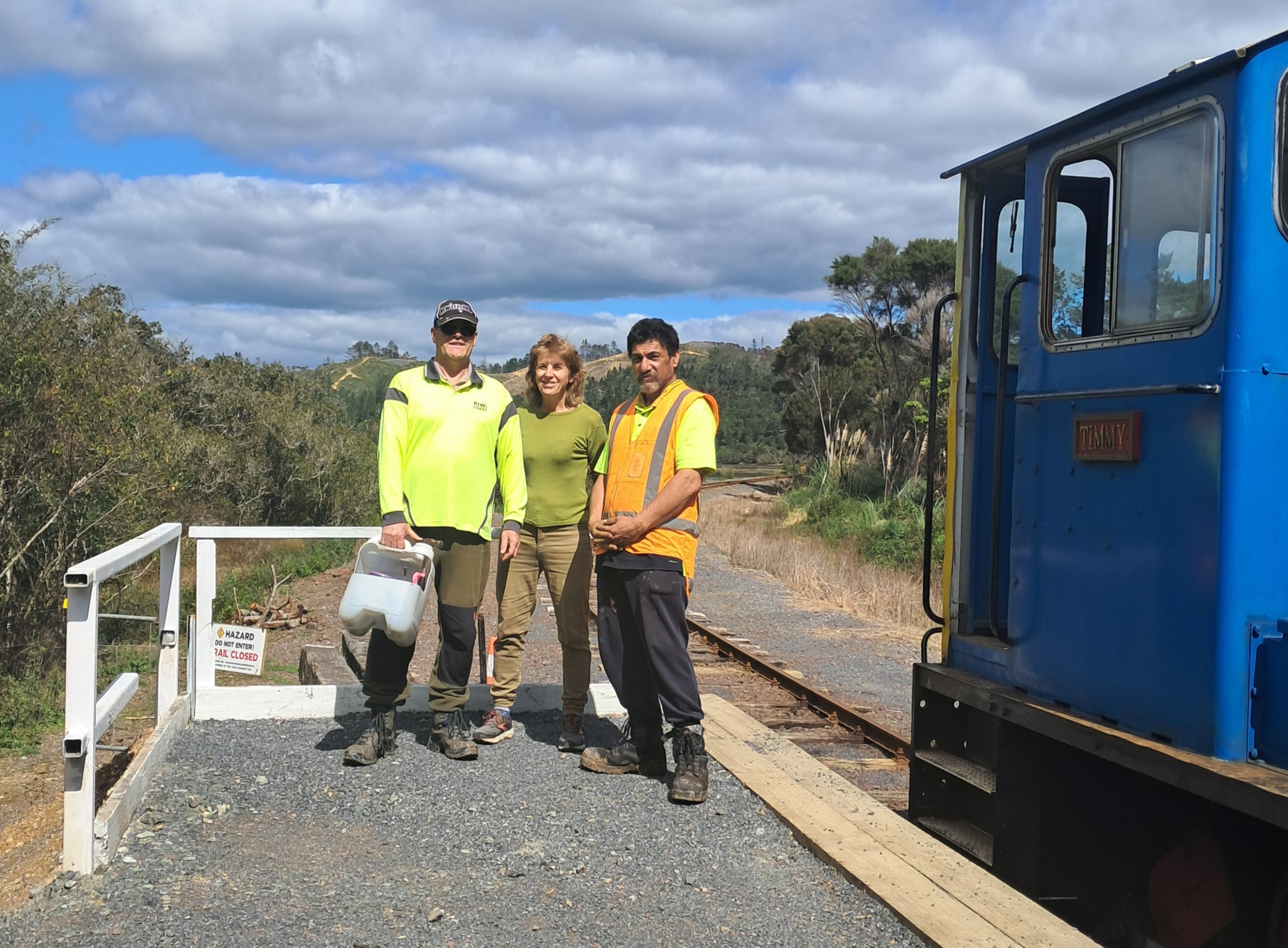 Andy from Kiwi Coast, Cynthia from Bay Bush Action and Gerratt from the Keteriki Rail Track crew. Photo: Keteriki Ltd.